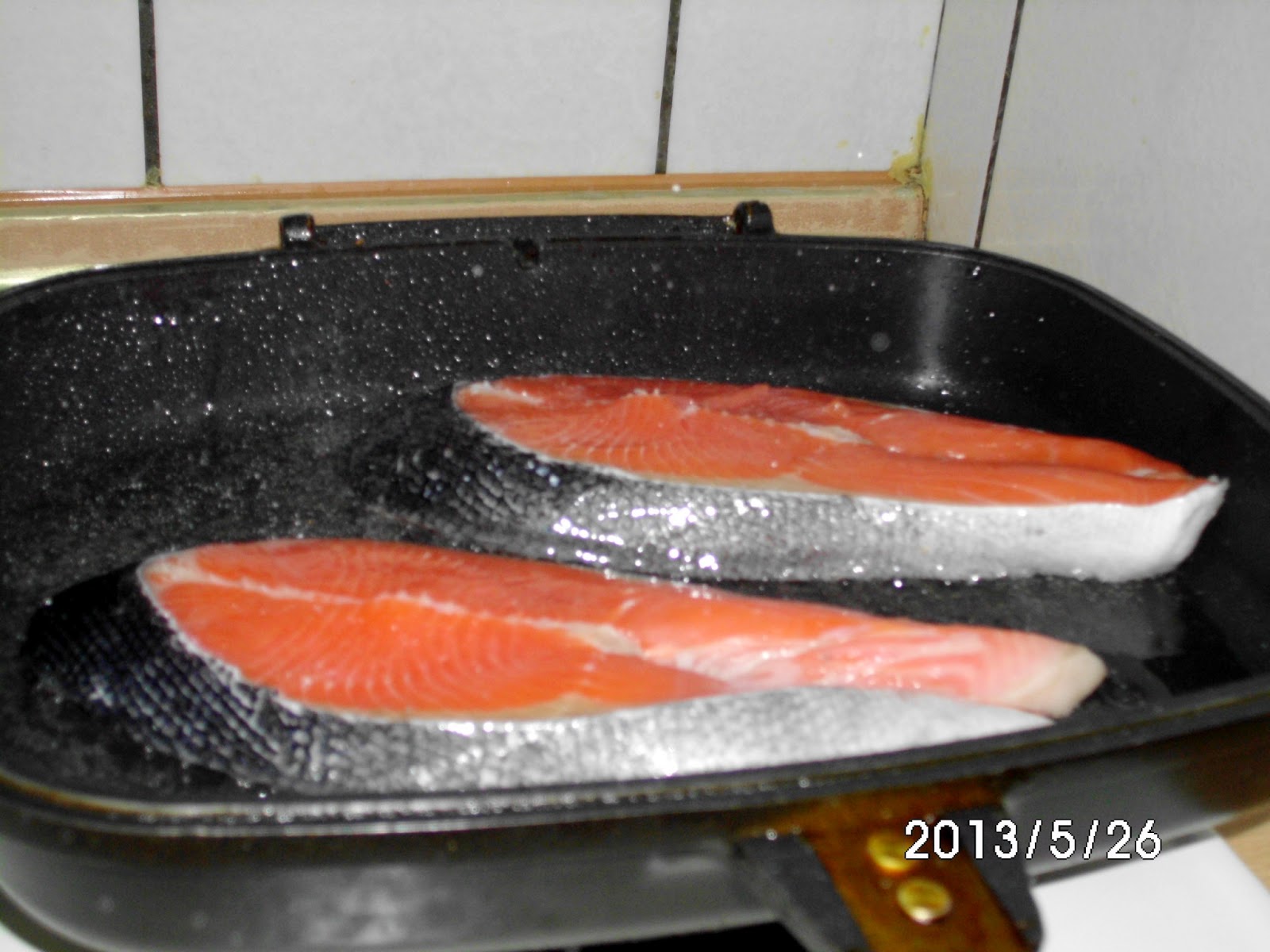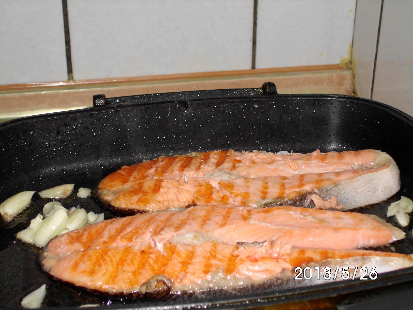 材料:鮭魚2片、大蒜5顆 調味料:米酒1大匙、鹽少許 作法: 1.鮭魚洗淨後淋上米酒1大匙,並將鮭魚兩面抺上少許的鹽,放置醃10分鐘以上。 2.熱鍋後放入2大匙油,油熱後放入鮭魚開小火煎至金黃,約3分鐘後再翻面煎另一面(魚未煎成金黃時不要去翻面,以免魚肉破碎,怕黏鍋可晃動一下鍋子)。 3.鮭魚另一面也略成金黃色後即可放入拍碎或切片的蒜頭煎出蒜香味後即可盛盤。